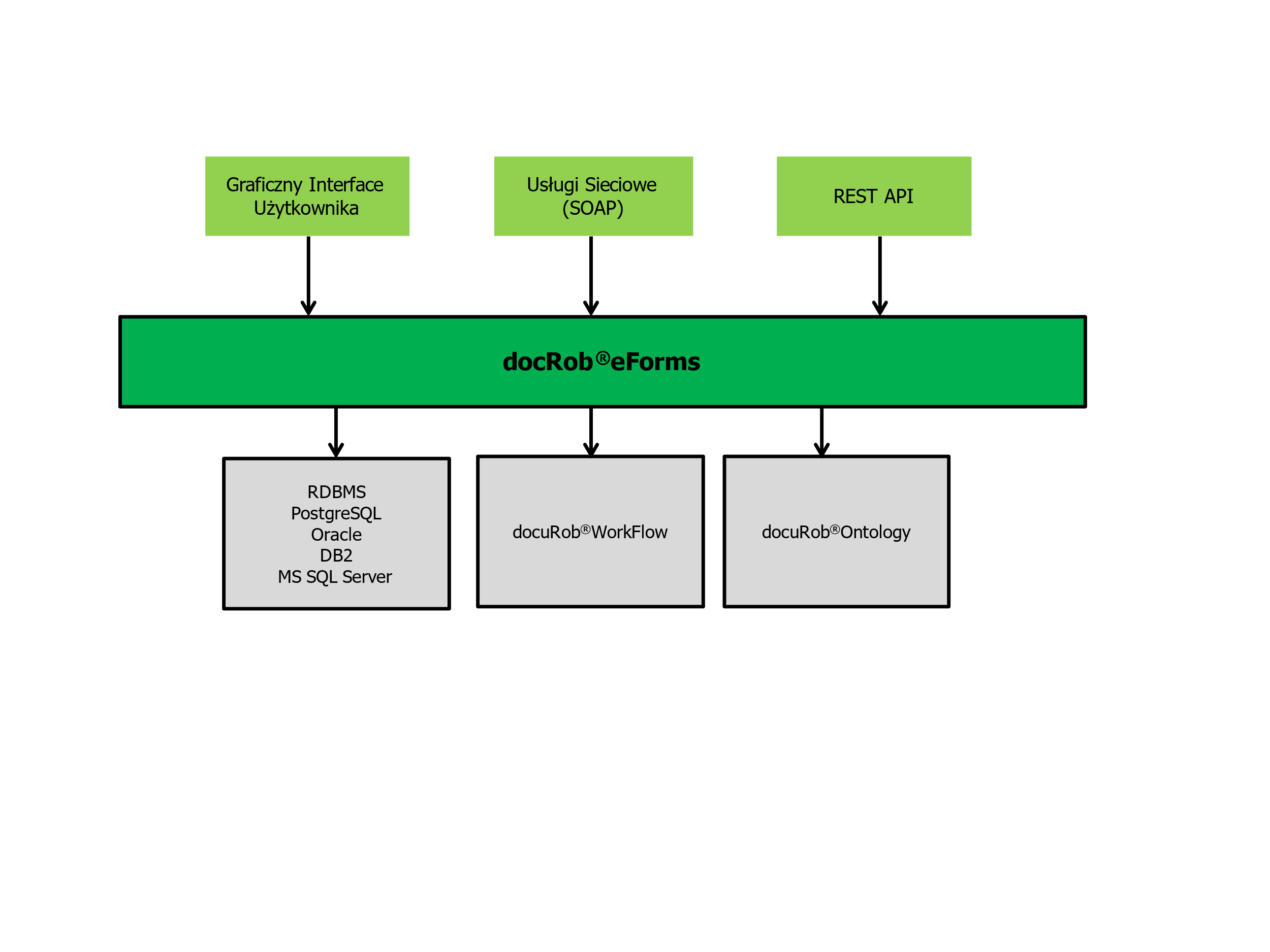 Ponieważ udostępniono API (ang. application programming interface) dla języka Java formularze docuRob®eForms mogą być również wykorzystywane jako element dowolnych środowisk oprogramowania narzędziowego. Powiązanie z architekturą podstawowych modułów oprogramowania narzędziowego docuRob® przedstawia Rysunek 1
