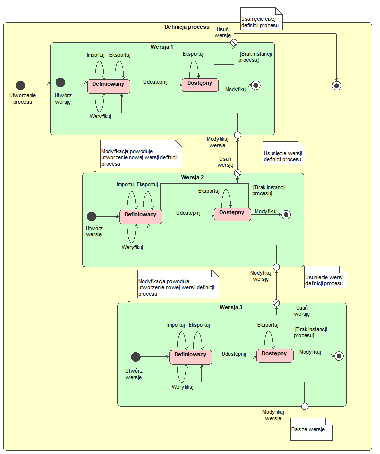 W momencie utworzenia definicji procesu tworzona jest automatycznie jego pierwsza wersja. Wersja procesu ta jest w stanie definiowany. W tym stanie można modelować proces i uszczegóławiać jego definicję. W dowolnym momencie można też zaimportować lub wyeksportować opracowywaną definicję (lub sam model) procesu. Poprawność wykonanych prac można sprawdzać poprzez uruchomienie weryfikacji procesu. W momencie gdy definicja procesu jest kompletna i poprawna można ją udostępnić. W wyniku tej operacji stan wersji procesu zmienia się na dostępny. W tym stanie można uruchamiać proces według nowej definicji. W tym stanie można też eksportować kompletną definicje procesu.
