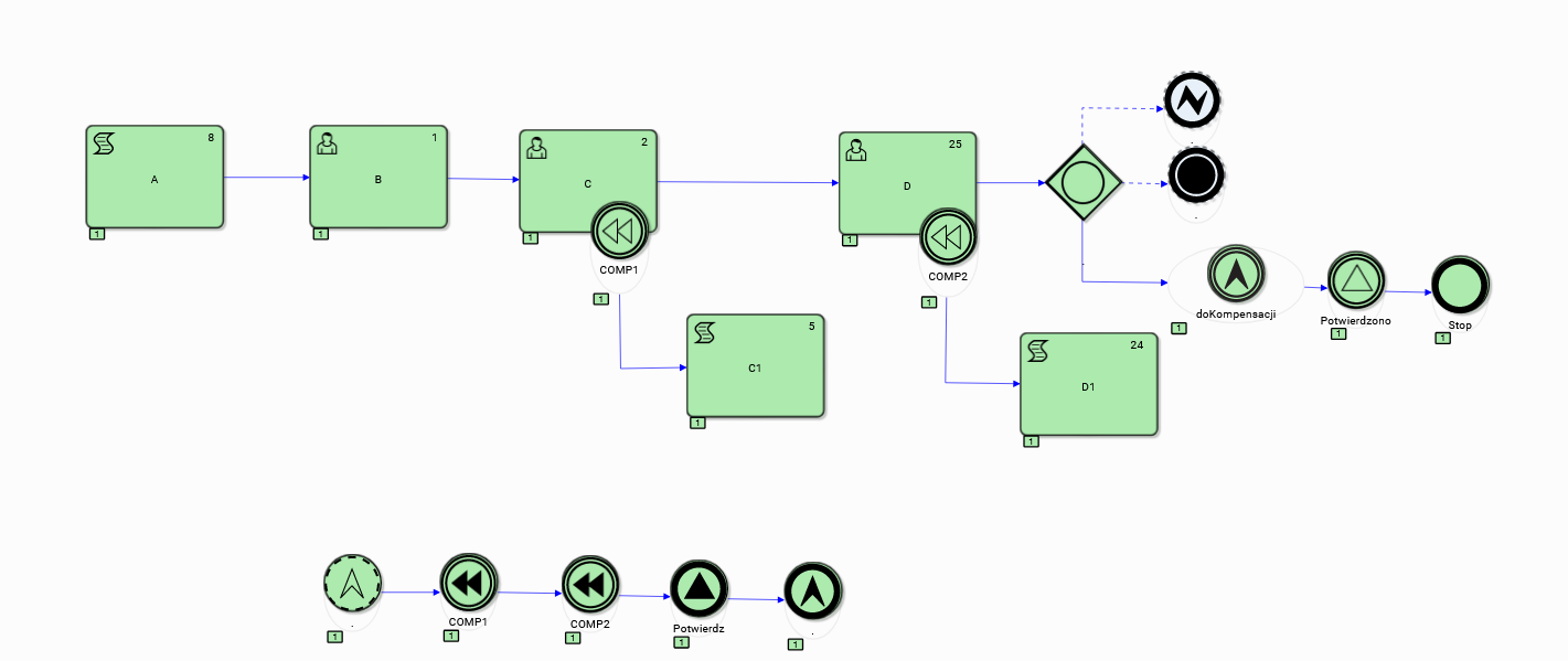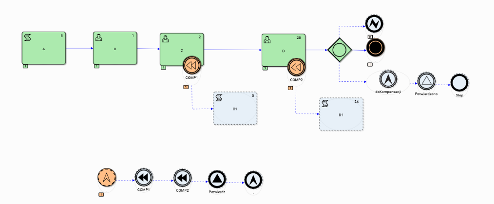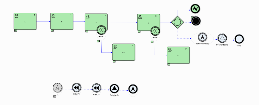 Po zakończeniu oczekiwanej ścieżki procesu uznano wynik procesu za błędny i wykonano krok2 poprzez uruchomienie Podprocesu sterowanego warunkiem (Warunek1). Podproces zawiera poza zadaniem D pośrednie zdarzenie rzucające Kompensacja uruchamiające czynność kompensującą C odwracającą wyniki zadania B. Instancja procesu została zakończona przez końcowe zdarzenie rzucające Błąd.