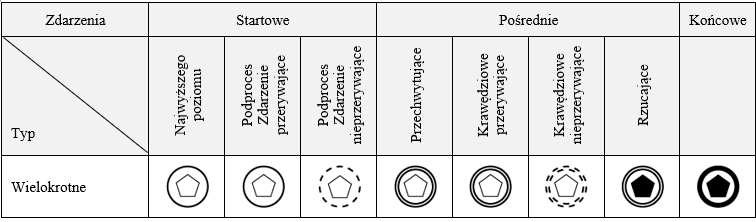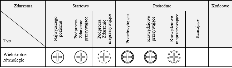 • Wielokrotne Równoległe (ang. Parallel Start) może aktywizować proces po wystąpieniu pierwszego zdarzenia. Instancja procesu może zostać zakończona po otrzymaniu i przetworzeniu pozostałych zdefiniowanych zdarzeń, które mogą napływać w dowolnym momencie wykonania instancji procesu.