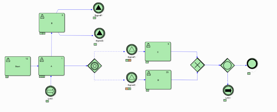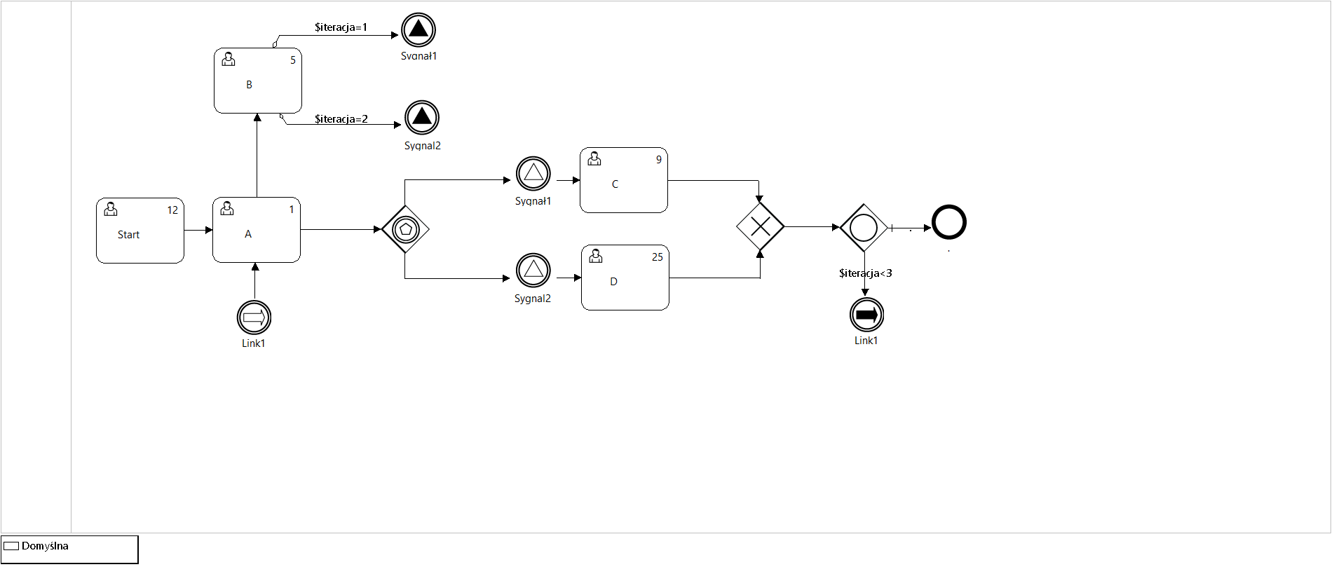 W modelu procesu zaproponowano w ramach iteracji dwa alternatywne wykonania fragmentu grafu procesu zawierające odpowiednio zadania C i D uruchamiane przez pary zdarzeń Sygnał. Przebieg iteracji zależy od kolejno uruchamianych zdarzeń rzucających a wybór zdarzenia zależy od ustawienia wartości globalnej zmiennej procesu $iteracja. Łatwo zauważyć podział modelu na dwa podgrafy, jeden stanowiący oczekiwaną ścieżkę procesu obejmującą zadania <Start, A, C|B> i drugi sterujący wykonaniem iteracji poprzez zdarzenia.