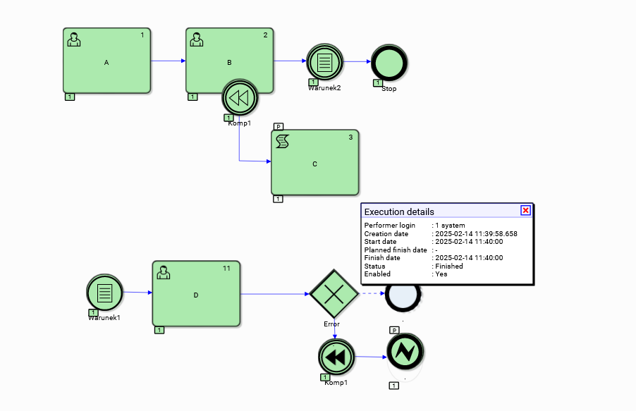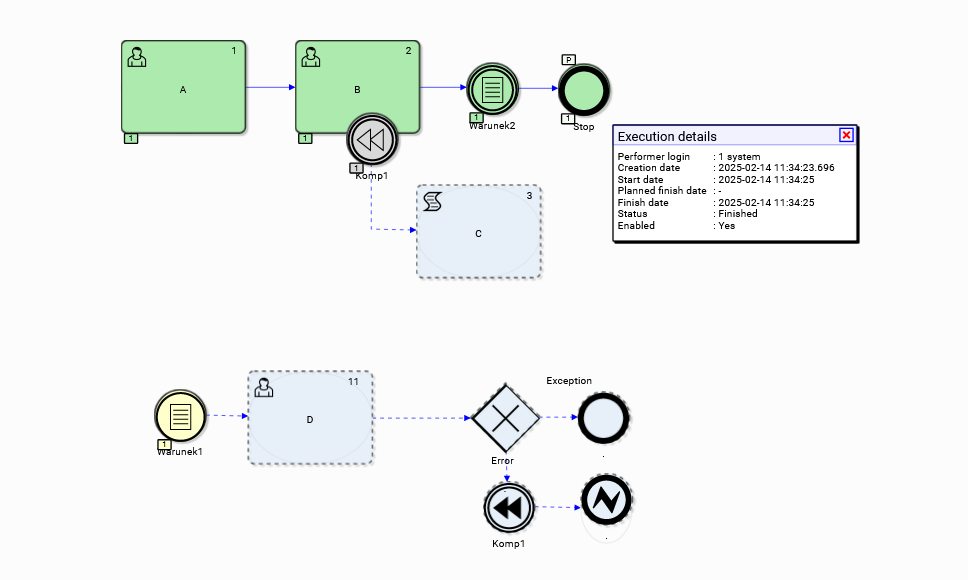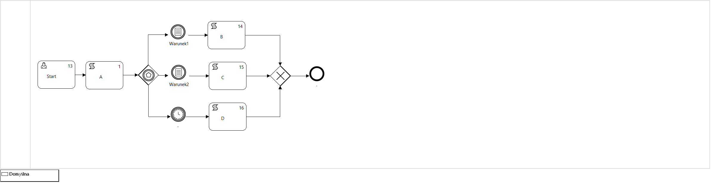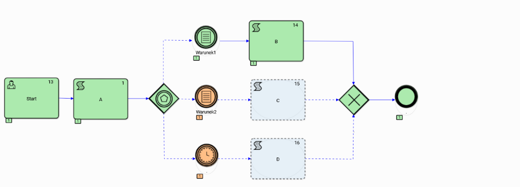 W pierwszym wariancie wykonania procesu zdarzenie Warunek1 zostało wykonane a pozostałe zdarzenia przerwane (Rysunek 4). W drugim wariancie żaden warunek nie został spełniony i po odpowiednim czasie Stoper przekazał znacznik do czynności D a oba zdarzenia (Warunek1 i 2) zostały Przerwane.