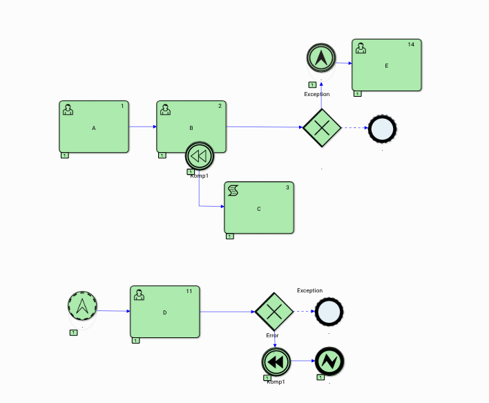 Po zakończeniu przetwarzania Podprocesu sterowanego zdarzeniem nie jest możliwy powrót do struktury przepływów okalającego go procesu. Podproces jest zamykany zdarzeniem końcowym rzucającym do pośredniego zdarzenia krawędziowego otaczającego go Procesu/Podprocesu. Przykład modelu, który przedstawia Rysunek 21, zawiera oczekiwaną ścieżkę procesu jako szereg zadań A,B lub A,B,E w przypadku wystąpienia wyjątku (ang. exception), przy czym wynik zadania B może być odwrócone przez czynność kompensująca C.