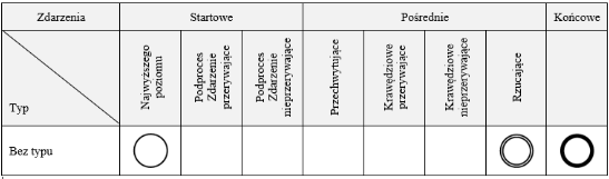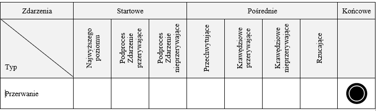 • W przypadku zdarzenia końcowego Zakończenie instancja obejmującego go Procesu/Podprocesu jest przerwana. Inne instancje tego procesu nie są kończone. Przerywane są wszystkie czynności występujące w tej instancji procesu również takie jak Kompensacja czy Podproces sterowany zdarzeniem.