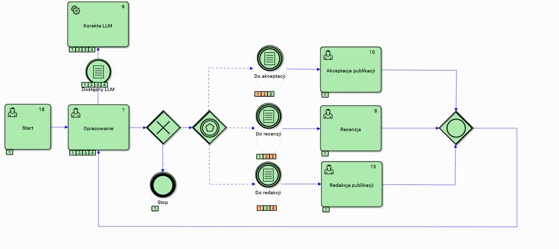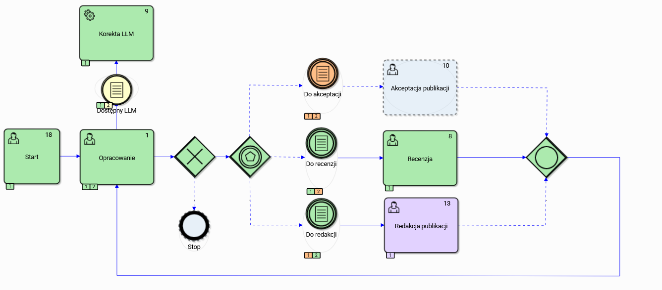 Przewidziano również wprowadzenie dodatkowego wymiaru automatyzacji przez integrację procesu z systemem LLM (ang. Large Language Model) wspierające prace na etapie ich tworzenia i oceny. Możliwość sterowania dostępnością wsparcia modelem LLM wynika z decyzji modelowanej przez odpowiedni warunek (zdarzenie typu Warunek) poprzedzający automatyczną czynność integrującą system LLM z procesem wydawniczym.