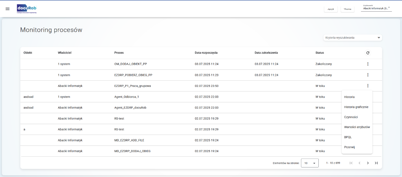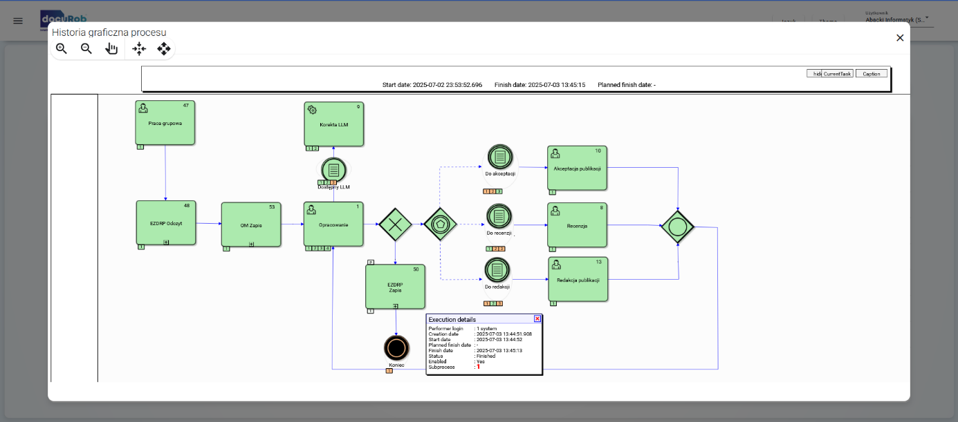 Każdy wpis w historii jest opatrzony znacznikiem czasu oraz identyfikatorem użytkownika (lub informacją, że akcja była wykonana przez system), który dokonał zmiany. Daje to pełną rozliczalność i możliwość odtworzenia przebiegu każdego procesu zadanie po zadaniu.
