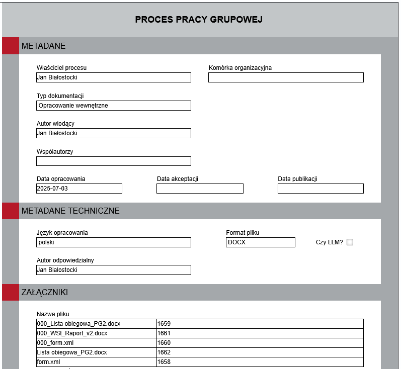 Model obejmuje również możliwość skorzystania z automatycznej analizy i korekty tekstu dokumentu wykonanej przez LLM (ang. Large Language Model).
