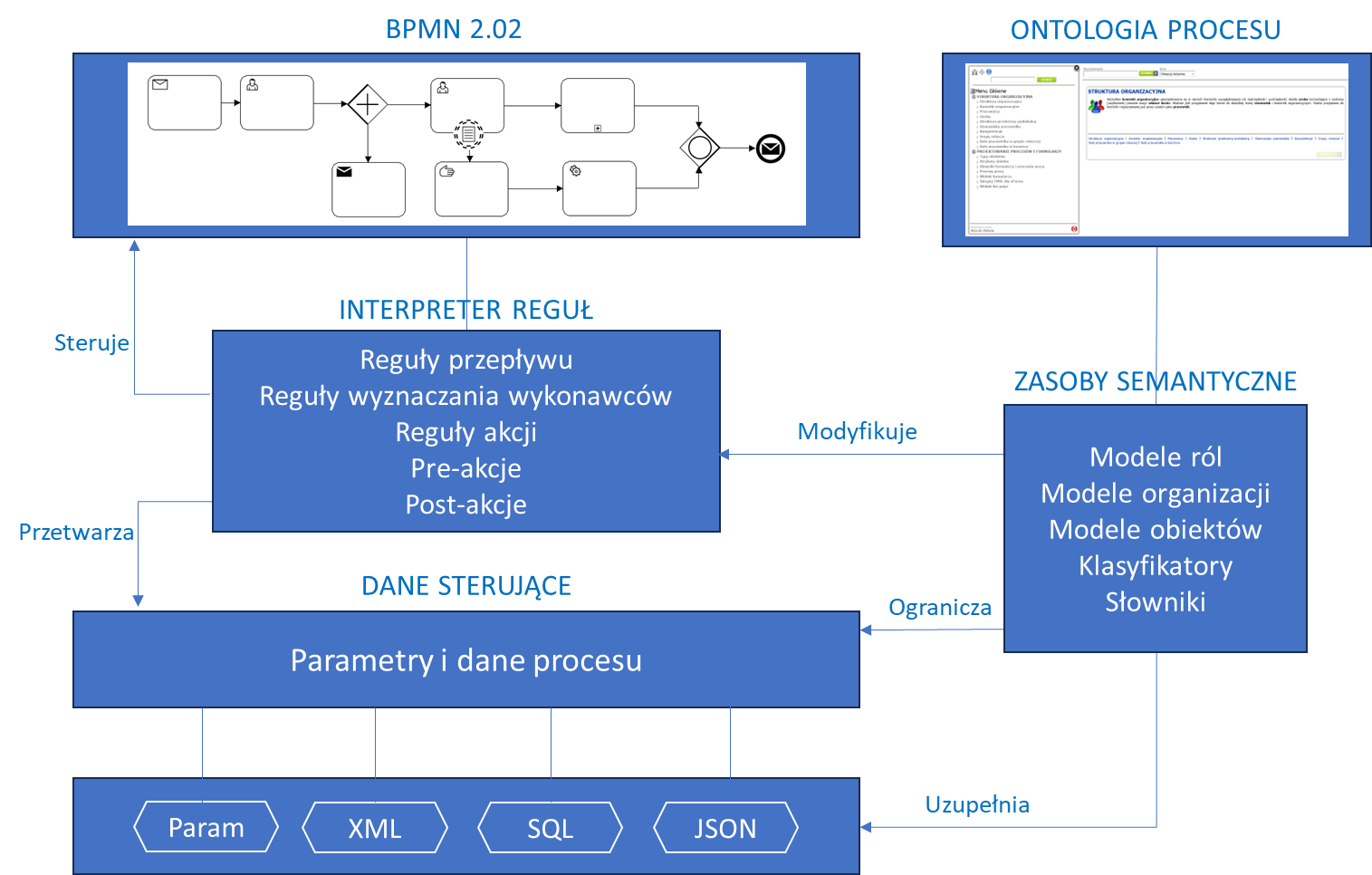 - Interfejs Użytkownika (UI / Cockpit): Webowa aplikacja, która dostarcza graficzne interfejsy dla użytkowników końcowych, projektantów procesów i administratorów systemu.
