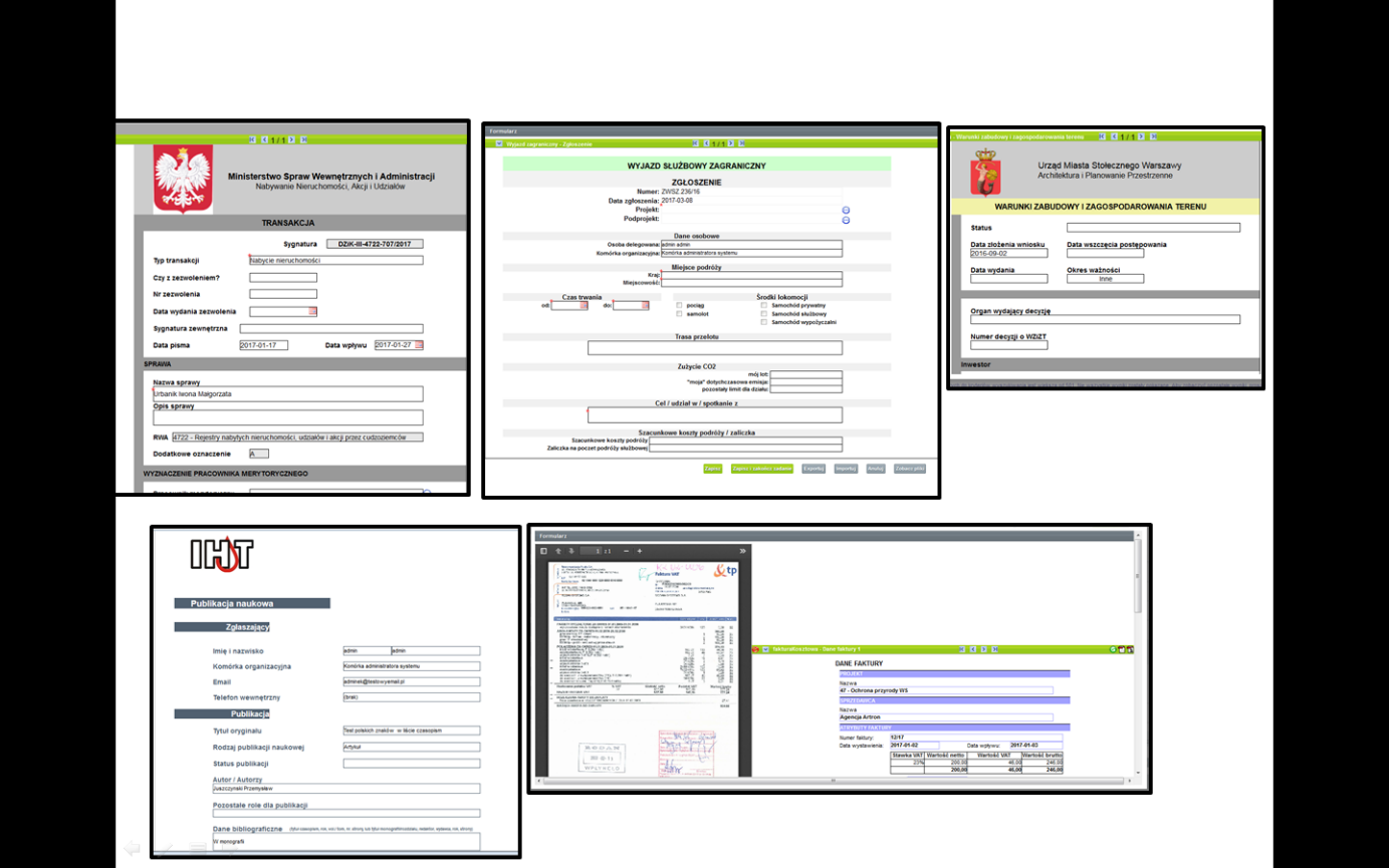 The extensive attributes of the form field definitions allow for a wide variety of their graphic designs. An example of the variety of graphic styles is the gallery of selected forms used in business processes implemented in docuRob® applications , which is presented in Figure 2 .