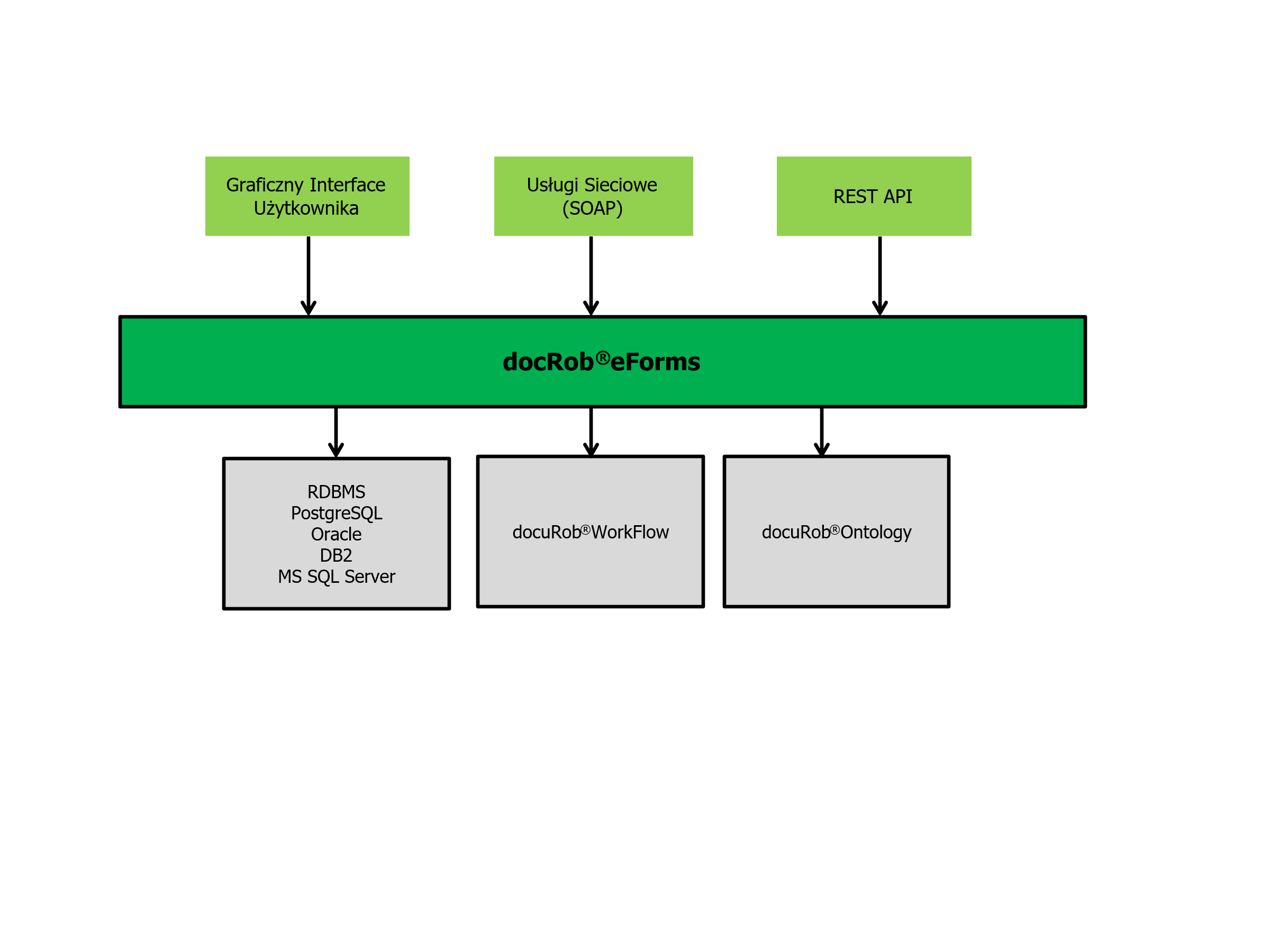 Because an API (application programming interface) for Java has been made available, docuRob® eForms forms can also be used as part of any software tool environment. Figure 1. Presents the integration architecture of the docuRob®eForms product.