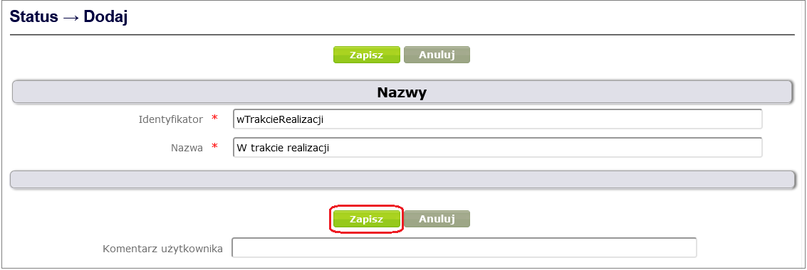 In the window for adding a new status, fill in the mandatory fields Identifier and Name, and then click the Save button ( Figure 20 ).