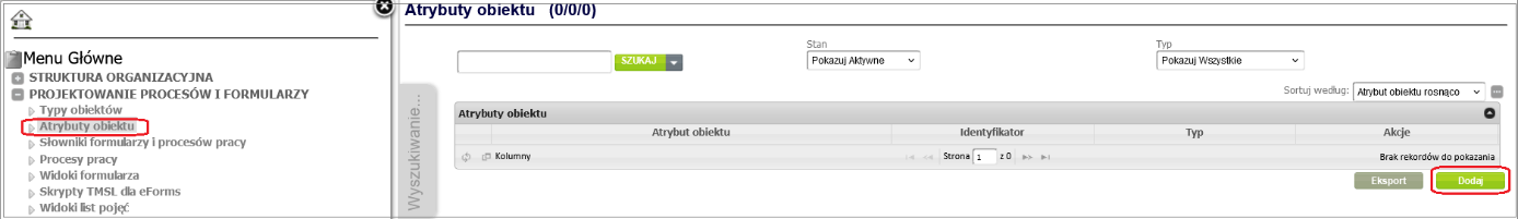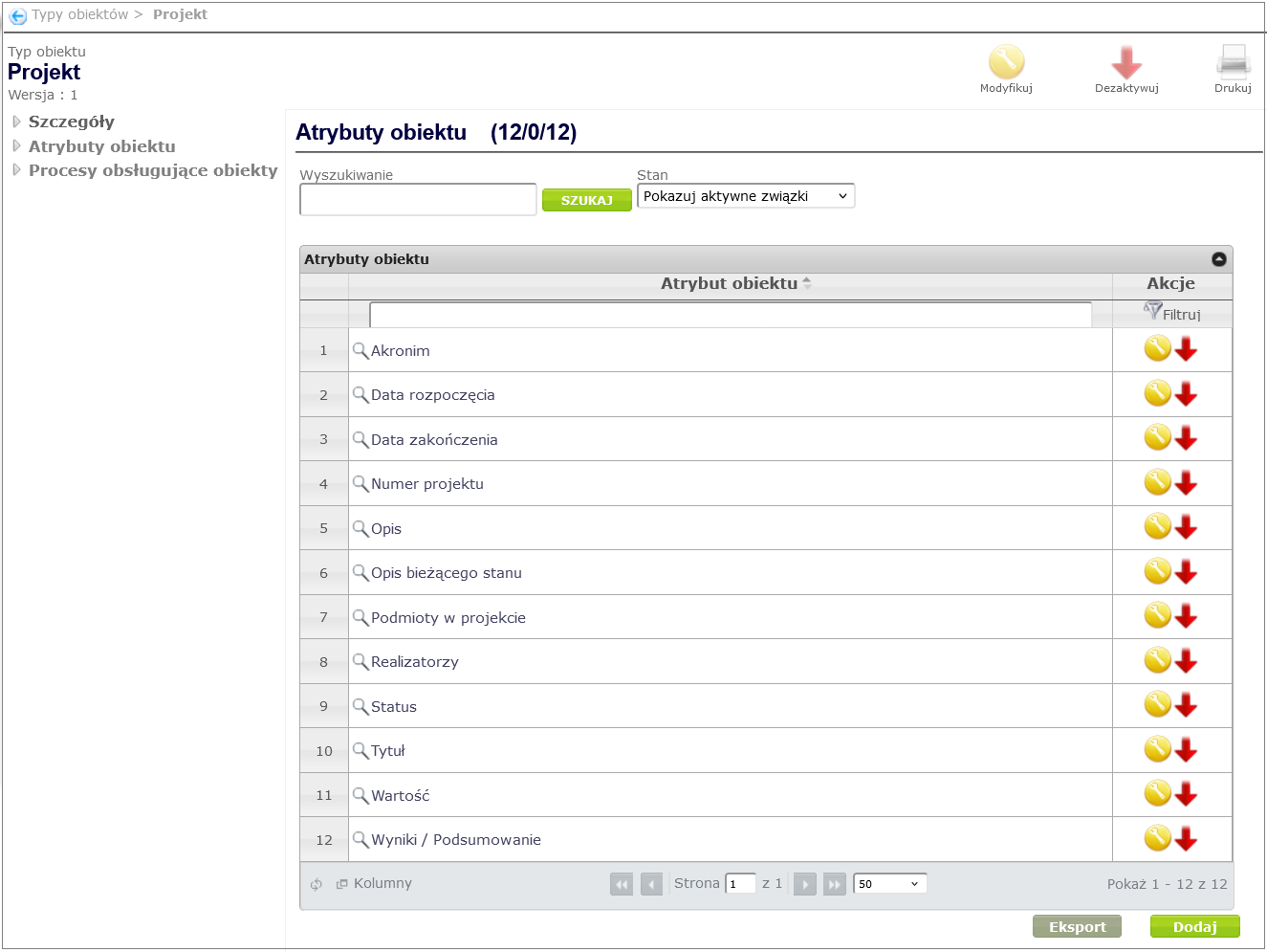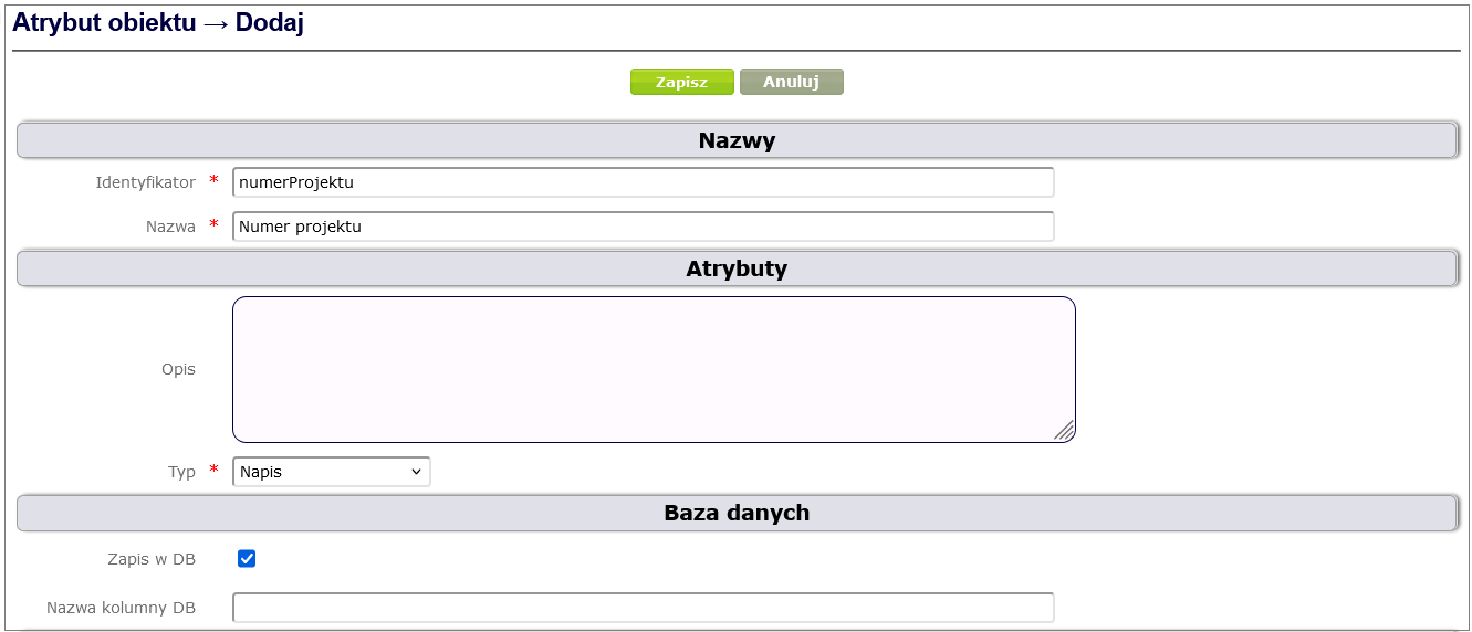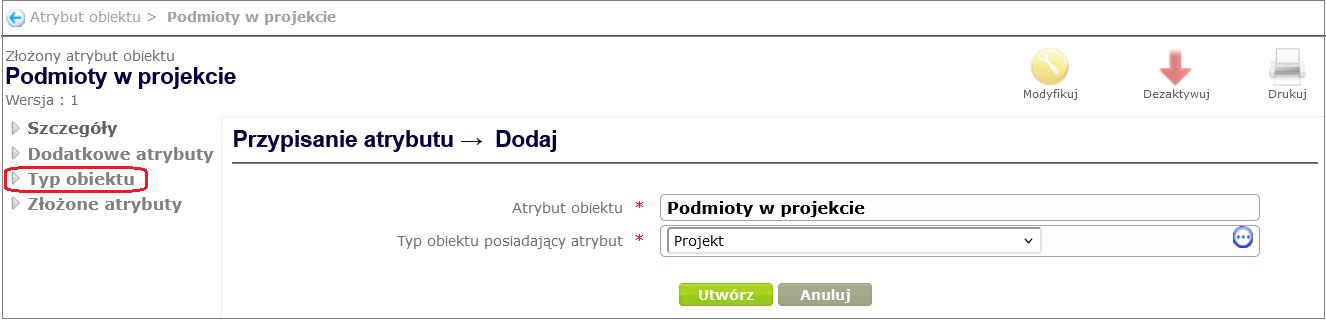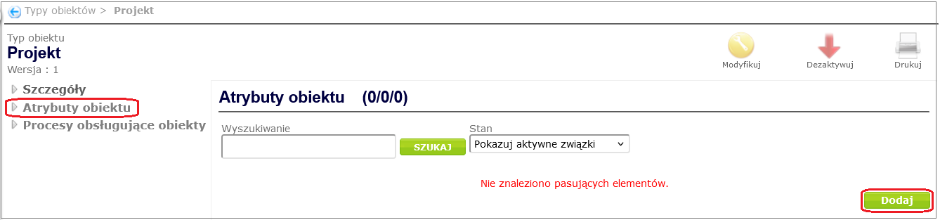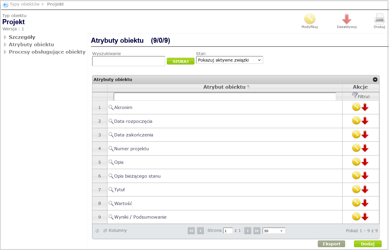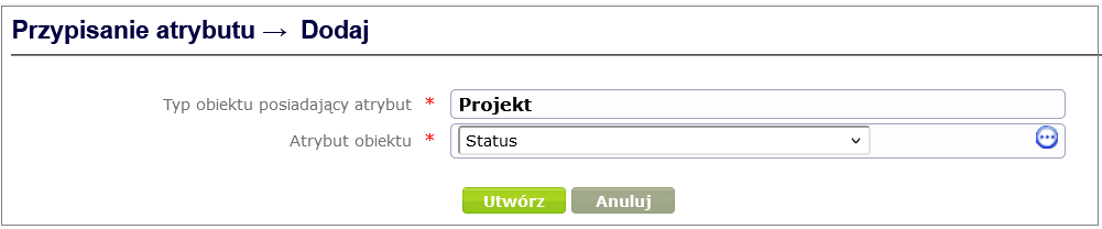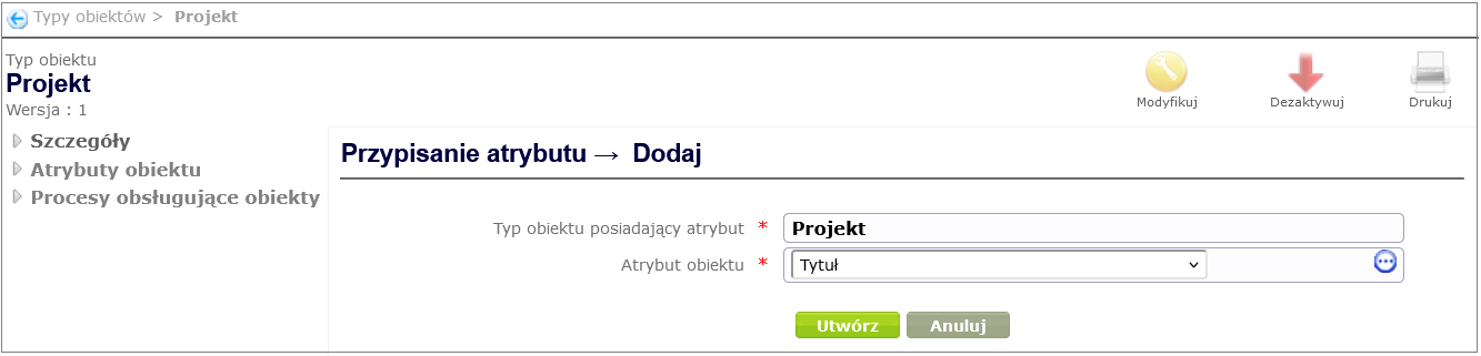 In order to link an object attribute to an object type (in our case Project ), go to the object type details window created in the Create object type chapter ( Designing processes and forms -> Object types and selecting the appropriate object type from the table by clicking on its name). After selecting the Object attributes option, a page with the object attribute table will open. By clicking the Add button under the table, you can add an attribute to the object type ( Figure 7 ).