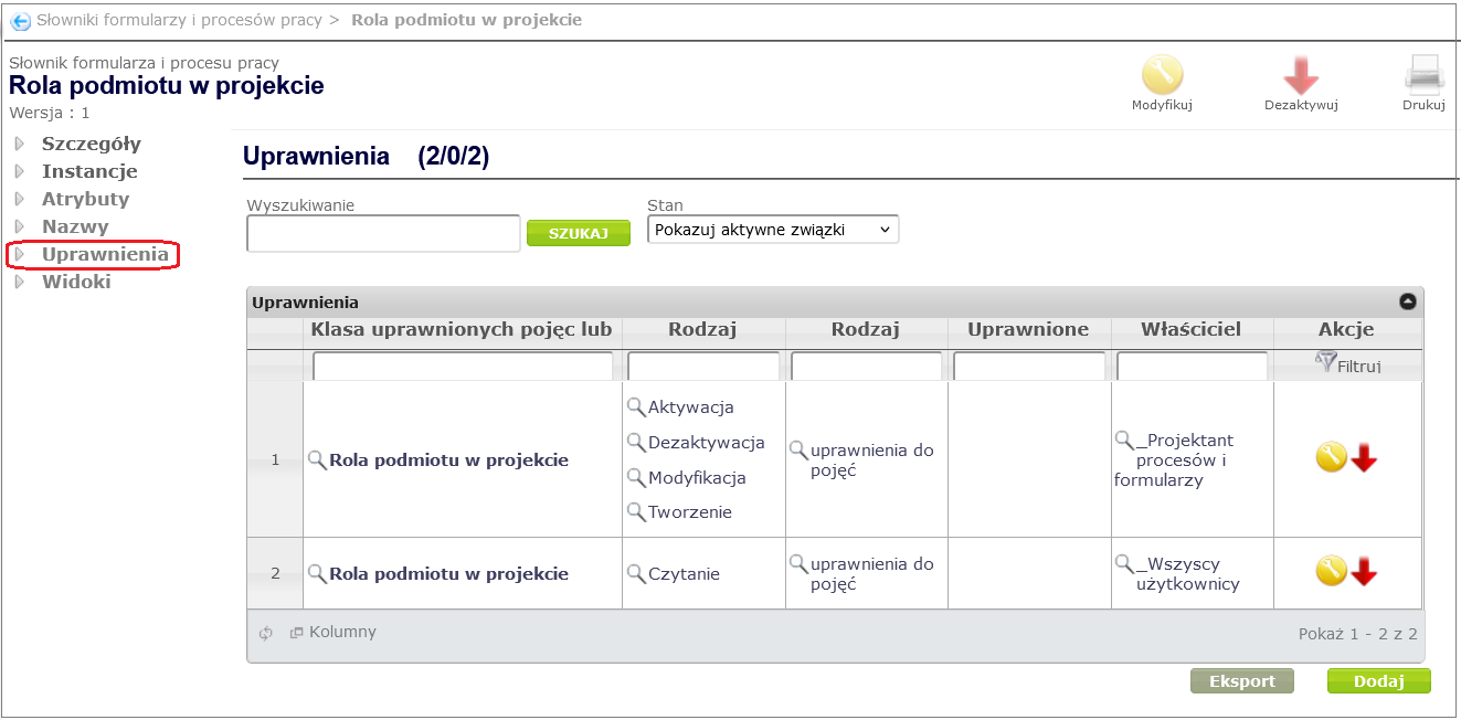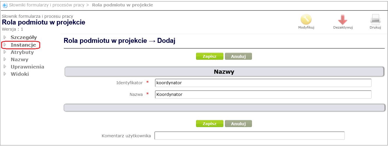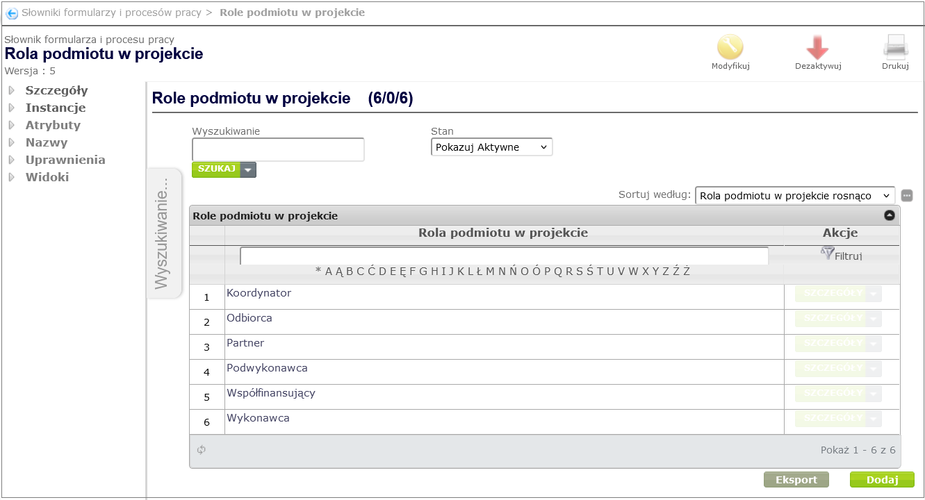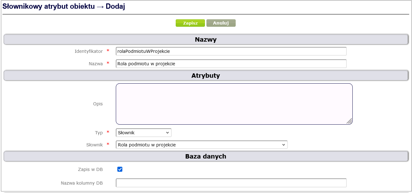 Figure 27. Dictionary attribute Role of the entity in the project