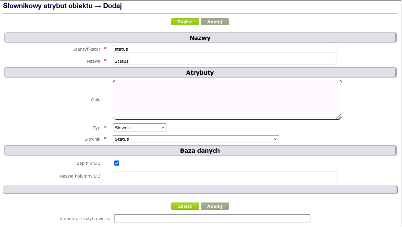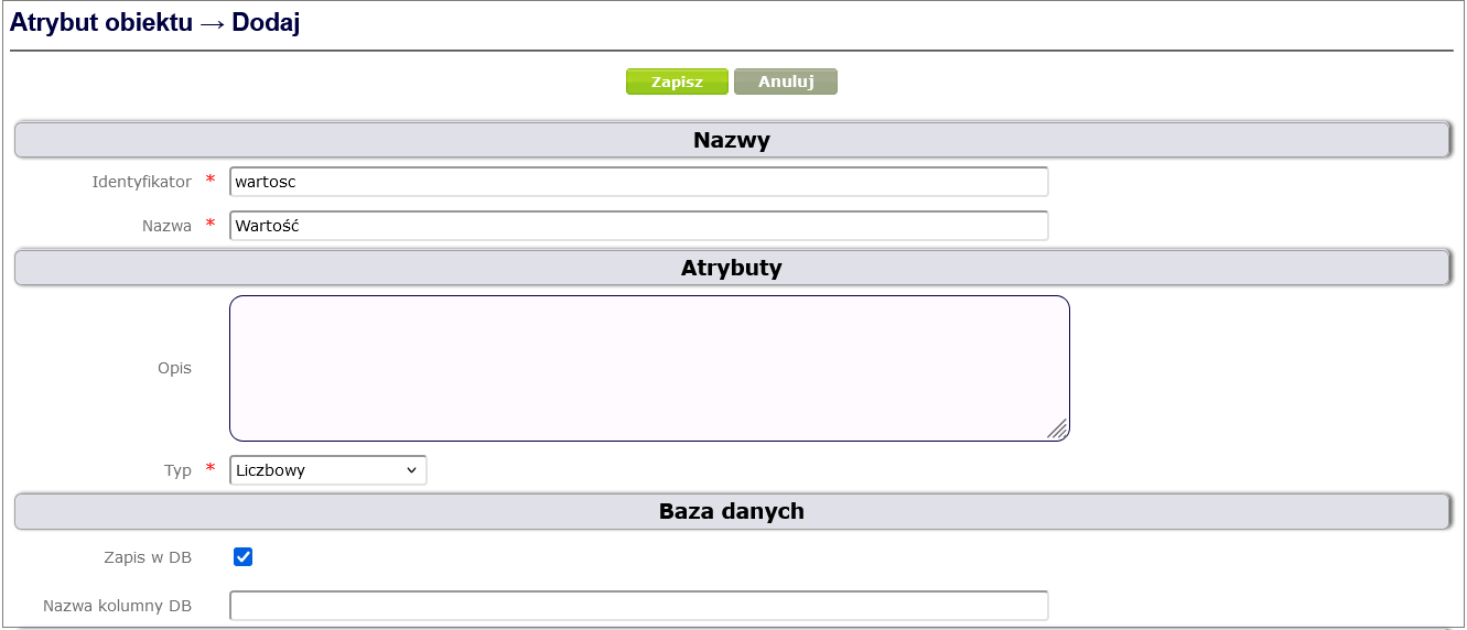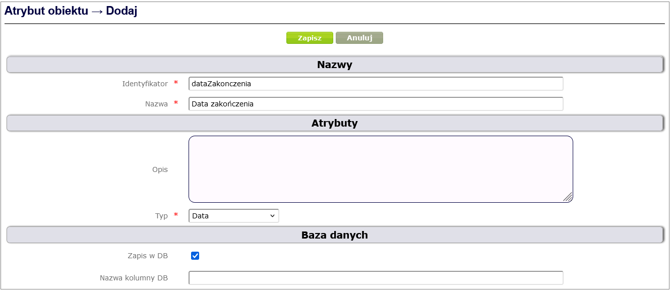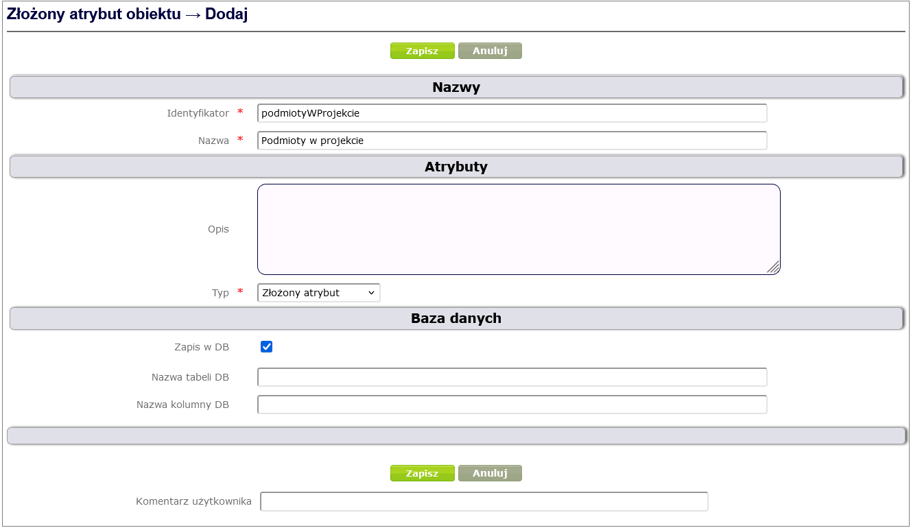 To define a complex attribute, click Process and form design -> Object attributes -> Add, select Complex object attribute, fill in the required fields and finally click the Save button ( Figure 24 ).