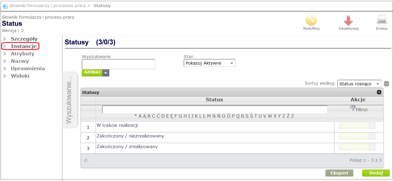 Figure 21. List of statuses in the Status dictionary