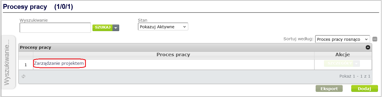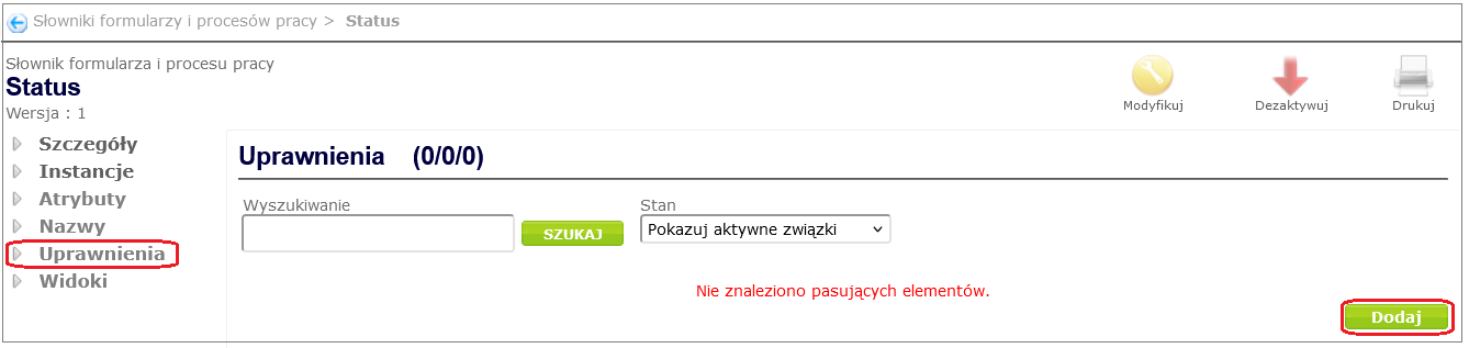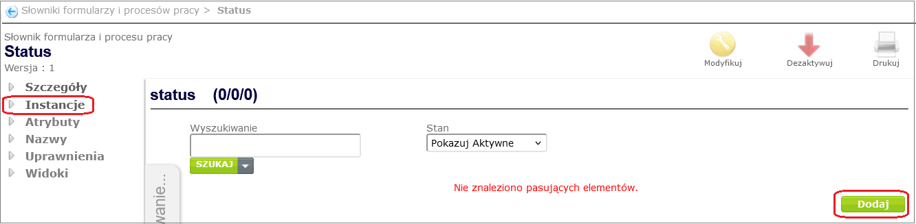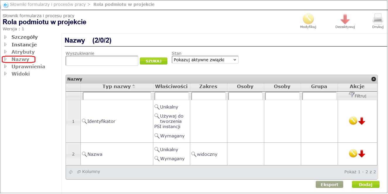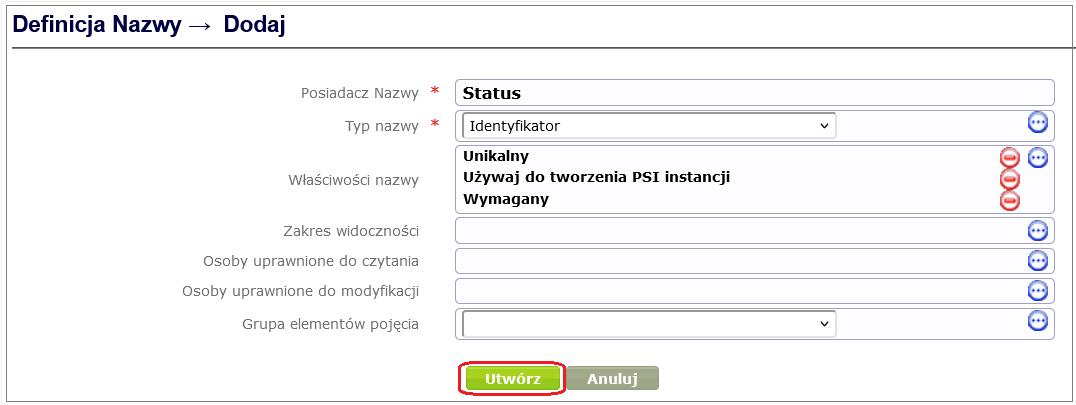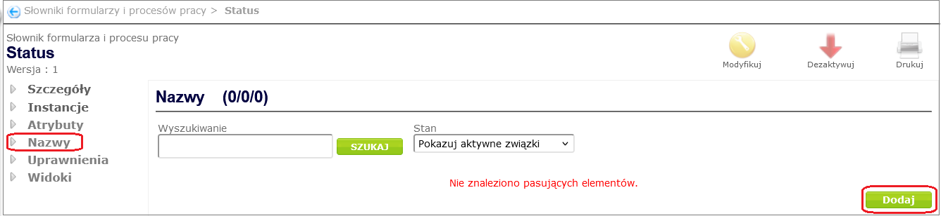 To add name types to the dictionary (in our case Status ), go to the dictionary details window ( Process and form design -> Dictionaries of forms and work processes, select the appropriate dictionary from the displayed list by clicking on its name), and then after selecting the Names option from the dictionary context menu, click the Add button ( Figure 13 ).