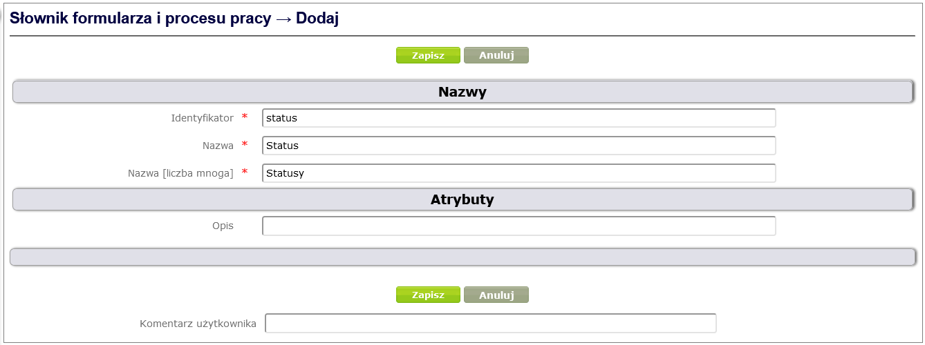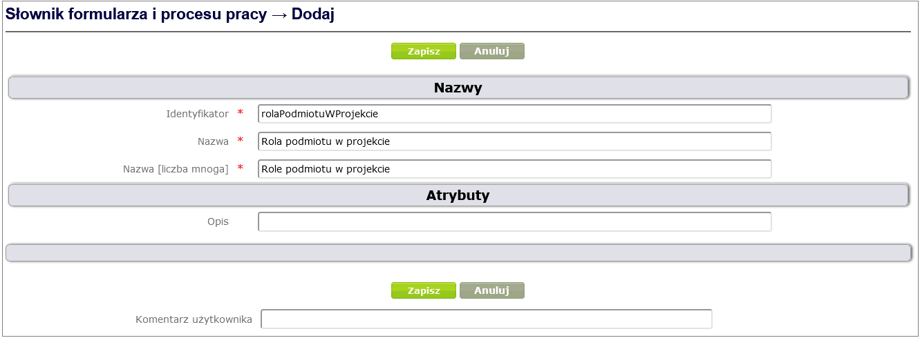 In the dictionary adding window ( Figure 12 ) you must fill in the required fields: Identifier and Name. You can optionally add a description. Finally, confirm with the Save button.