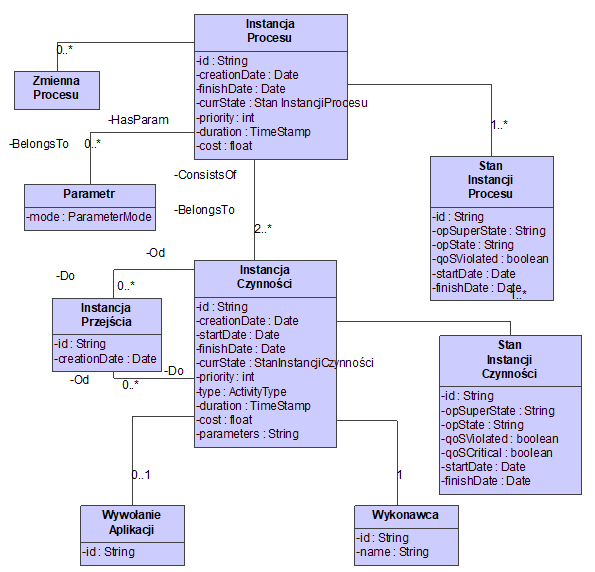 The class diagram of the runtime process model , which is shown in Figure 7 , is created based on the corresponding process definition available in the process repository of a given docuRob® WorkFlow installation . The meaning of the individual attributes of the model classes is presented in Table 2 .