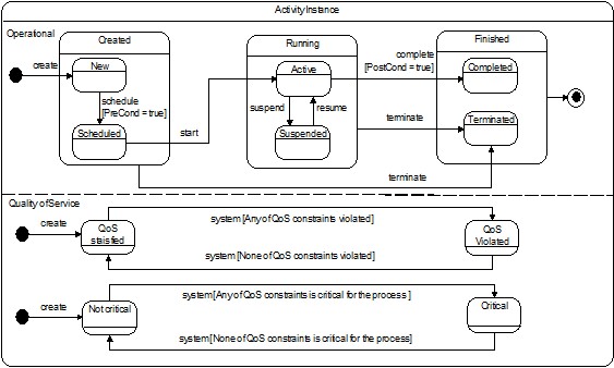 The model of activity instance states ( Figure 9 ) is also presented using a state diagram. This model distinguishes two types of states: those related to the operability of the activity instance and those related to the quality of the service being performed.