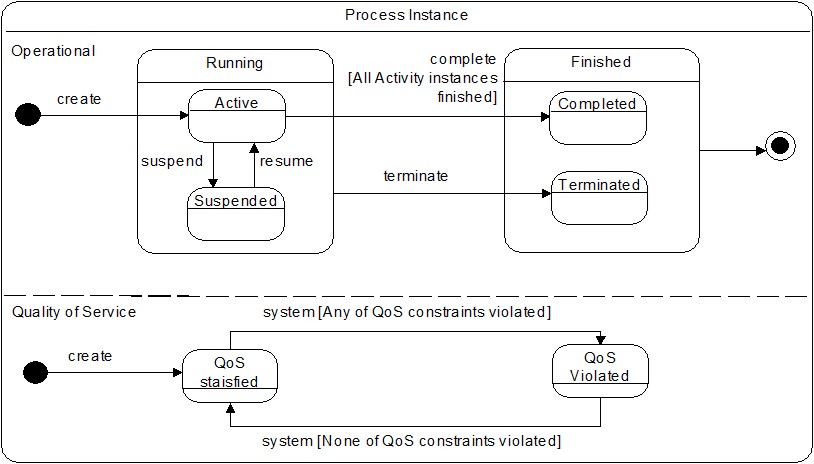 The state model of a process instance is presented in Figure 8 . A process instance reflects its state in two planes: through operational states and through states related to the quality of service (QoS). Operational states indicate what is happening with a given process instance. QoS states reflect how quality constraints are met.